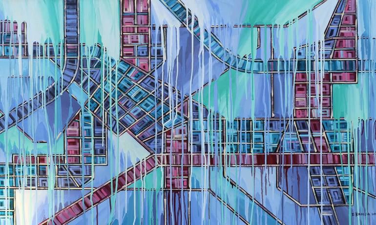 An abstract interpretation of an aerial view. The inspiration of my work comes from interpreting digital images of the planet’s geography through modern technological applications such as Google Maps, and Global Positioning System. I use real road trip images and data from my GPS, together with scr...
