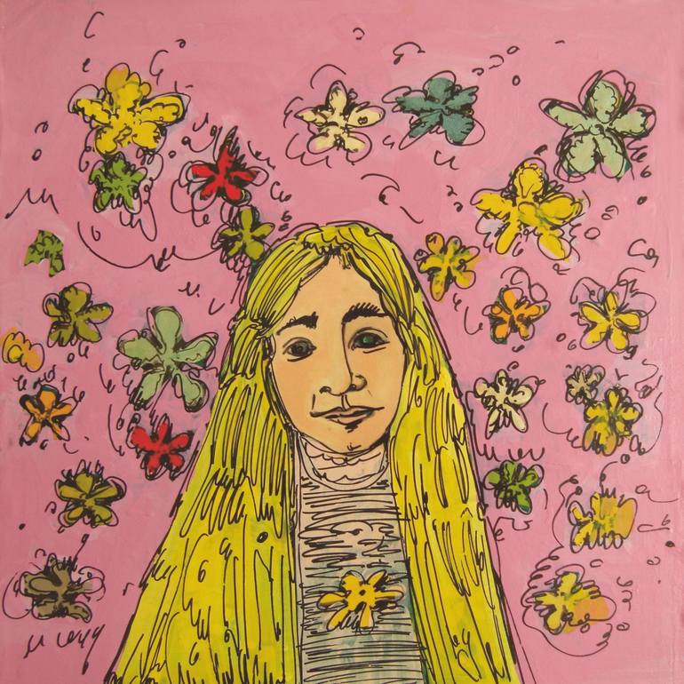 Fiorentina Giannotta (New York, 1964). Fiorentina Giannotta's poetics is characterized by a mix of history, irony and a lively exploration of colors and materials. Her works celebrate imperfect and ironic characters, immersed in imaginary and decorative landscapes, which invite the viewer to a visual and emotional participation, rather than a mere contemplation. Giannotta's characters, often inspired by historical figures or fictional protagonists, are conceived as "imaginary ancestors" with whom to establish an emotional companionship, creating a sense of personal connection and almost pleasant obsession. This choice is influenced by the ironic potential of the characters themselves. Elements such as lace, buttons, ribbons and bows add humor and lightness, making the works accessible and fascinating. Giannotta's influences range from great painters to novels and fiction, combining to create figures that express emptiness, rebellion and imperfection. Flowers and slogans are recurring elements in her works. Flowers, used as a decorative background, create artificial landscapes that reinforce the idea of an imaginary world. Slogans, such as “live, laugh and love” or “I am not the Mona Lisa of the Louvre but the Mona Lisa of your home”, add strength and participation to the works, involving the viewer more. Giannotta experiments with various materials in addition to classic acrylics, using industrial paints that allow her to play with consistencies and transparencies. Her favorite colors, such as Nissan green, Barbie pink, Barragan pink, butter yellow, oyster white and iridescent white, allow her to obtain both watercolor and thick effects. This technique, together with the small squiggles made with ceramic brushes, gives her works a three-dimensional and dynamic effect, further accentuating the vitality and energy of her compositions.