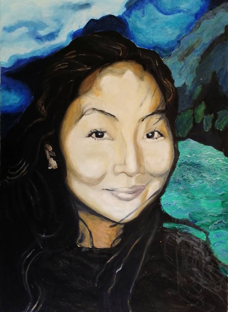 This is a large portrait of the Artist's wife, Aey, done in 2013. The figure in the painting is larger than life. Her enigmatic smile, dominates an imaginary scene, loosely based on the bay of Chaloklam, on the tropical paradise island of Koh Phangan, where they both live. It is painted with great c...