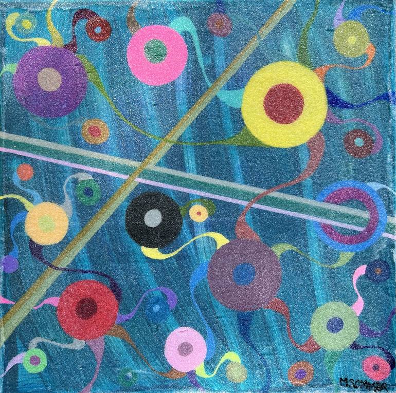 This is a smaller piece in my lyrical abstract series. It is painted with acrylic paint in wood panel on 5 sides. Then covered in a thick layer of glass bead in medium. This is about interconnection, interdependence, balance, joy, rhythm, and harmony. This series is about joy tempered by universal l...