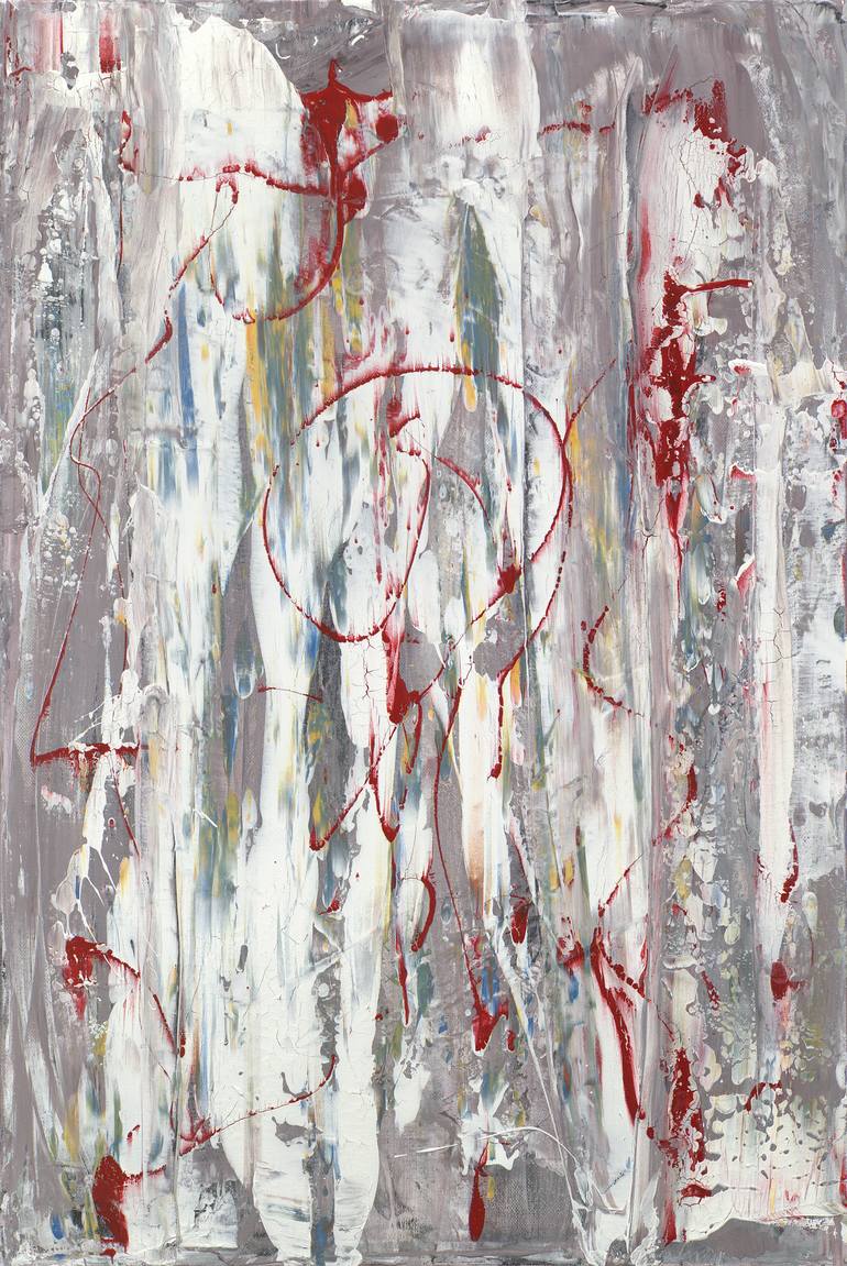 A dramatic yet subtle abstract painting with gentle tones punctuated by 'bleeding'