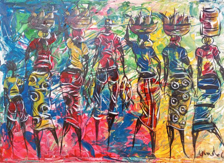 AFRICAN MARKET PAINTING This painting represents the African market. You can see women and a man carrying fruits to sell... *Magnificent painting with action or movement if you like. The colors are strong and vibrant. - Large original painting - Height: 70cm- 27.56" - Width: 90cm- 35.43" - Artis...