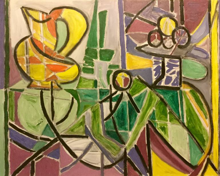 Picasso once again inspired this work which is an oil and charcoal painting on heavy duty gallery wrapped canvas. The piece is Fauvist and Cubist influenced and is alive with color. It is abstract yet figurative and the bright colors add warmth to a fictionalized kitchen or table scene. The canvas i...
