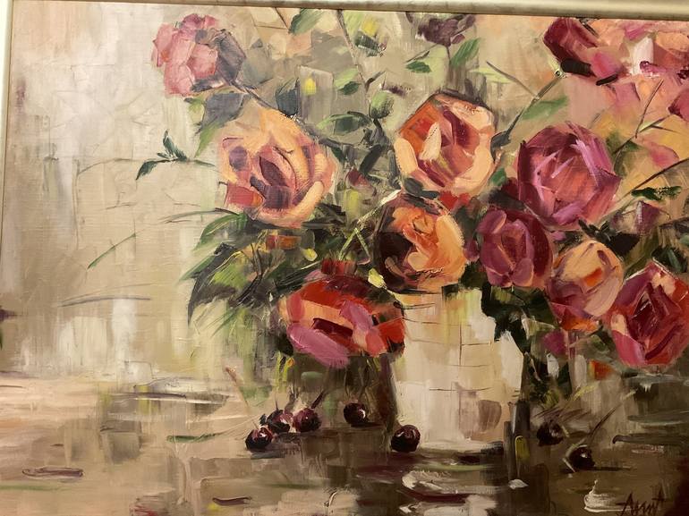 Roses after rain ,with sweet cherry. The combination of unusual, colourful Color’s is very harmonious. The composition is composed as if carelessly,not on purpose ,which gives it a special share and originality.