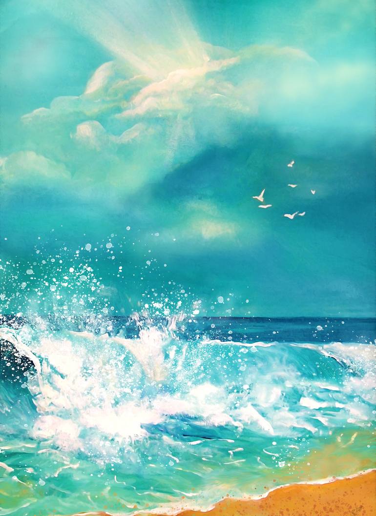 After a big winter storm I went to the ocean with my dogs and this is what I was looking at. I liked the waves and sky so much that I took several pictures, went home and started created this painting. I hope you enjoy the painting or a print as much as I do.