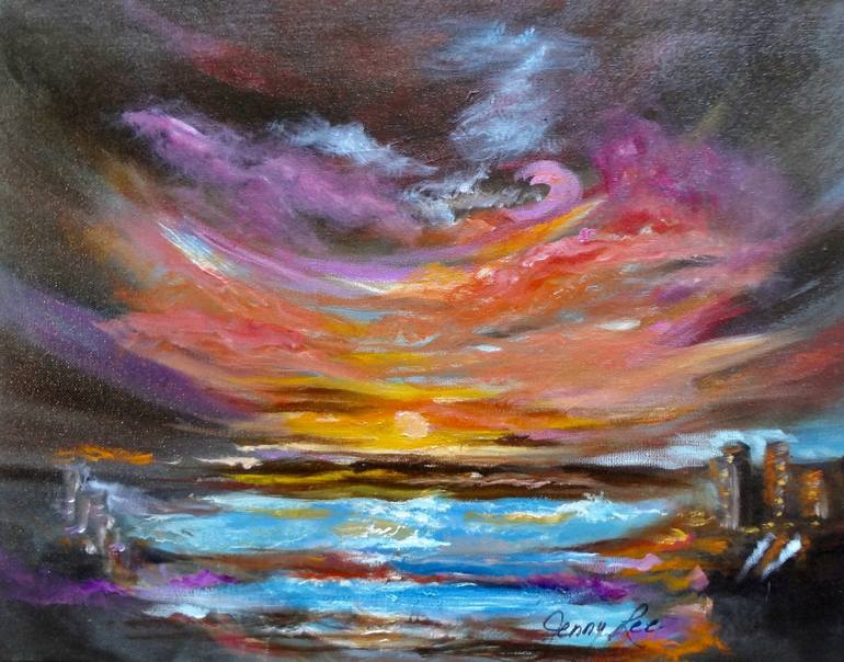 Original oil painting on stretched canvas unframed. The bright yellow sun peeks throuogh the clouds promising a bright new day.