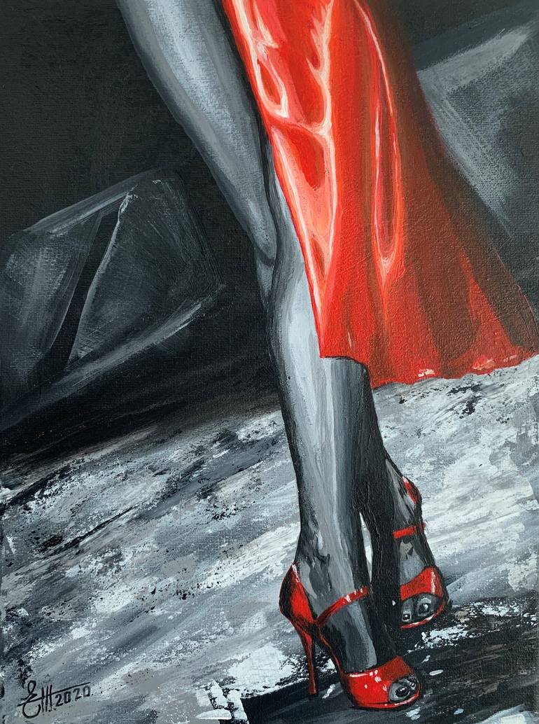 How beautiful the red silk flows on slender legs. Acrylic on canvas.