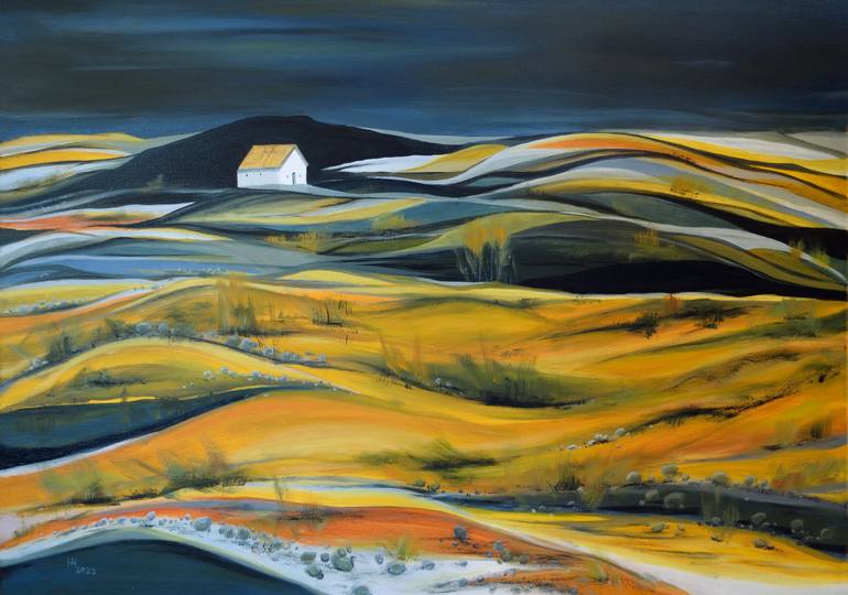 Original semi-abstract rural landscape with a white house on the hill. The painting is about a colorful nature scene with dark blue sky and yellow, green grassy lands after a storm. The artwork is made with oil on canvas. The painting is signed in front (+back) and accompanied with a certificate of ...