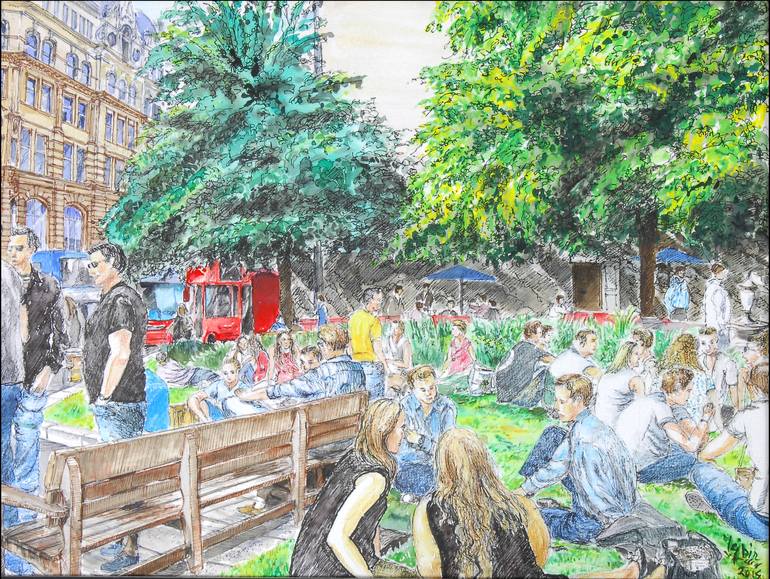 A bright summer day in London brigs out all the people out especially in the parks & pubs. Th red london bus & phone booth is there in the background as the architectural heritage.