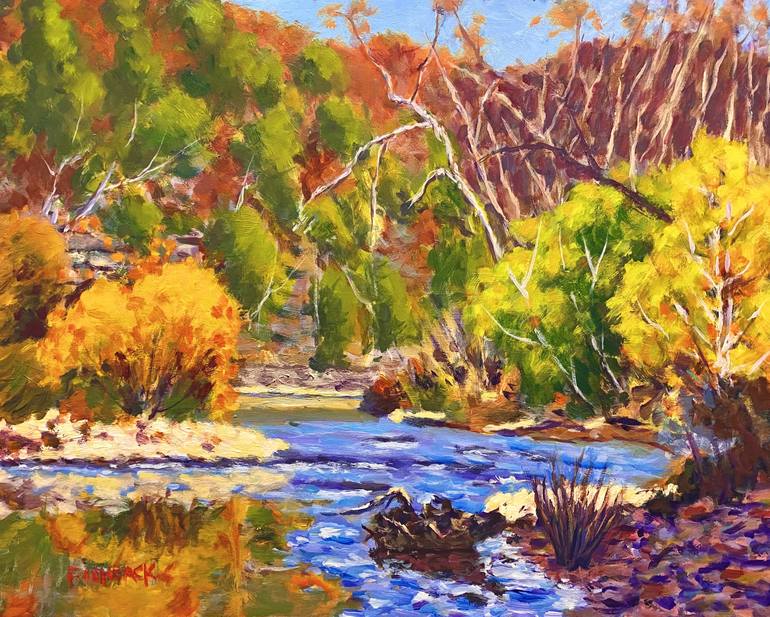 This painting began on location at the Jacks Fork River in the Missouri Ozarks. I finished it in my studio and had a lot of fun with it. I hope you get the feeling of the river gurgling amid the quiet surroundings. This painting is framed in a nice wooden dark frame and is ready to hang on your wall...