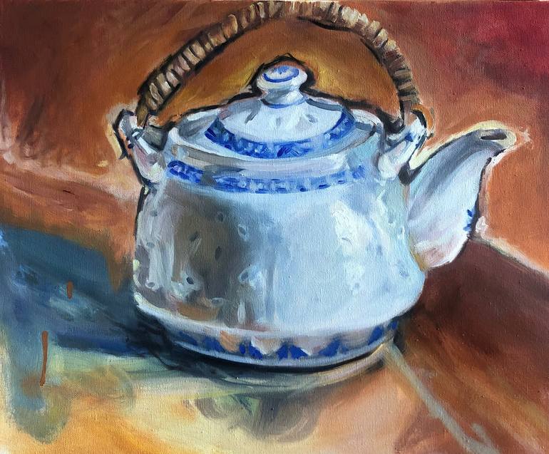 Afternoon tea, Oil 40x50cm Laraine Kaizer Joensuu July 15 2021 Still life with shadows in orange blue and green