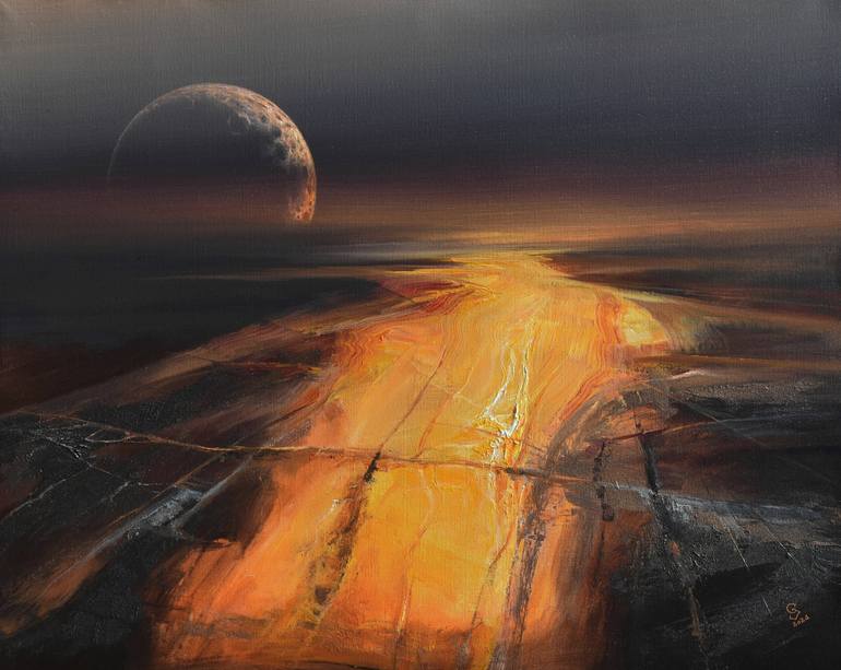 Original artwork description: " Agartha - The Rising Of The Ancient Moon - 3 " .....Painted with expressive moves.......with pallet knife and with a brush.....W 100 x H 80 cm ,( W 97 x H 77 cm ,when the canvas is stretched on the wooden frame ).... I'm giving all best ,to be represent the true color...