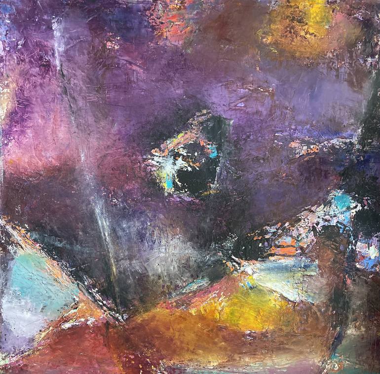 This piece is very rich in violet hues. It is a perfect square and can be rotated to give you a new perspective whenever you like. It is very warm and changed with the light!