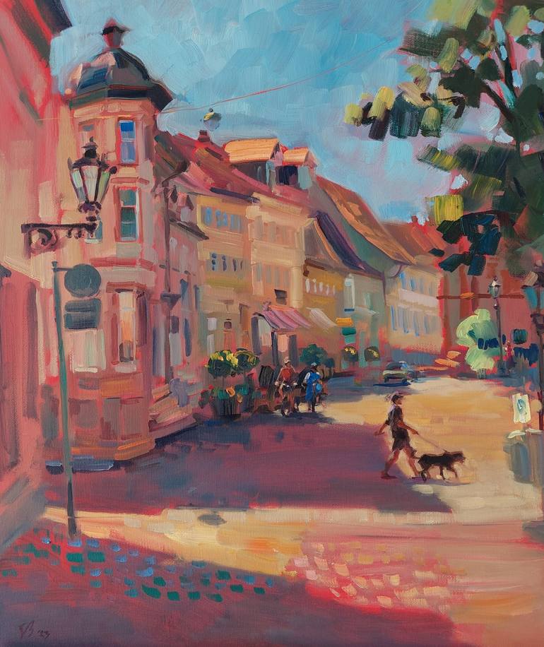 August in Durlach The picture was just painted in the open air. Plein air painting Street in Old Town Durlach, South Germany. Cozy little town in summer. Figures stroll through the streets. Warm sunny day in August
