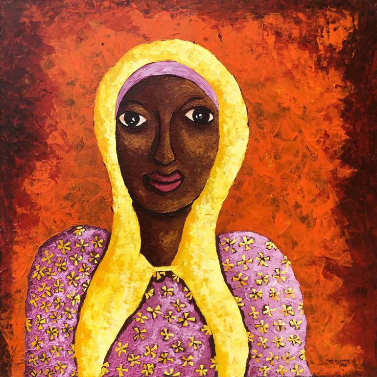 This painting celebrates the Muslim woman and how they look beautiful in their religious way of dressing. The floral dress emphasizes the beauty.