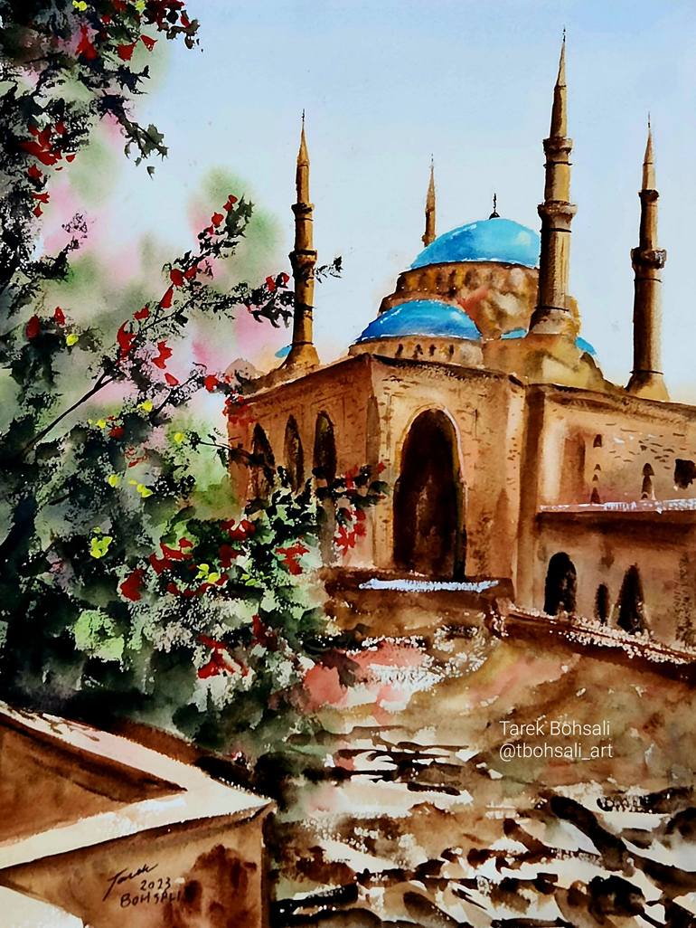 The painting shows the iconic Al Amin Mosque in Beirut from a unique angle that also depicts old Roman ruins in downtown Beirut as well as a flowering tree that adds a touch of natural beauty.