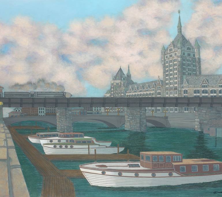 My painting features a 1930s scene of the Albany Riverfront. In the foreground are vintage wooden boats docked at the Albany Yacht Club. In the background is a New York Central train crossing the Hudson and the tower of the Delaware and Hudson Building. The tower is capped with a weathervane depict...