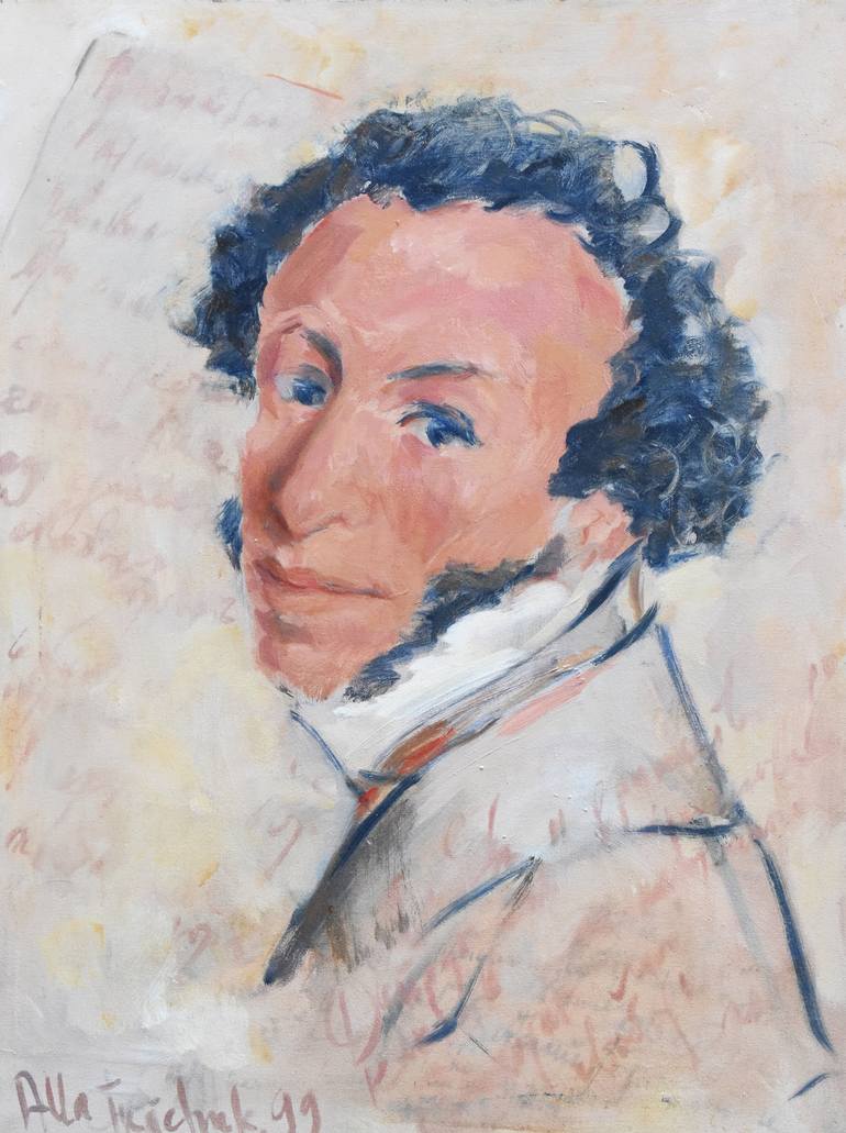 This study of Alexander Pushkin, part of the ongoing series celebrating the great Romantic-era poet and novelist, captures both his presence and the literary spirit he embodies. In the background, faintly rendered writing evokes the world of his texts, suggesting the enduring power of his words. Thr...