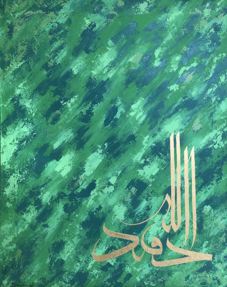 "All Praise is Due to Allah. This stunning abstract calligraphy piece embodies the essence of 'Alhamdulillah' - a phrase that acknowledges the power and majesty of Allah. Original Alhamdulillah Painting the background is done with palette knife and Alhamdulillah is written with gold foil paint mixed...