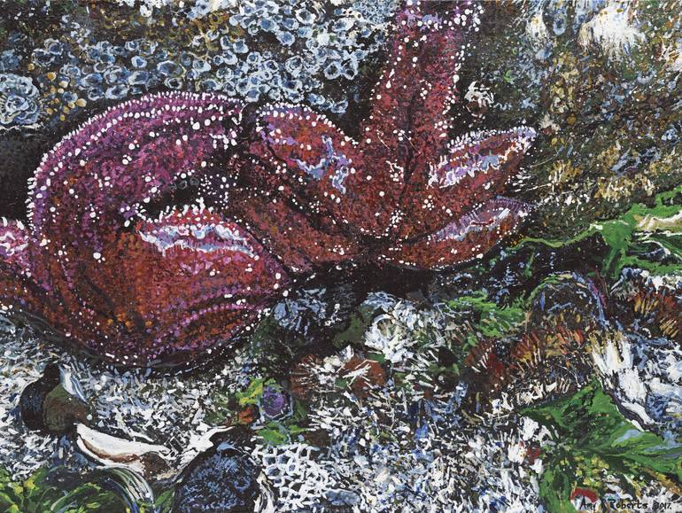 Part of an ongoing series of Pacific tide pool magnifications from Alki Beach in Seattle. photographed these large starfish by holding my IPhone under rocks to see what I could work with on canvas back home in MA. Wood strip frame stained Mahogany built by the artist.