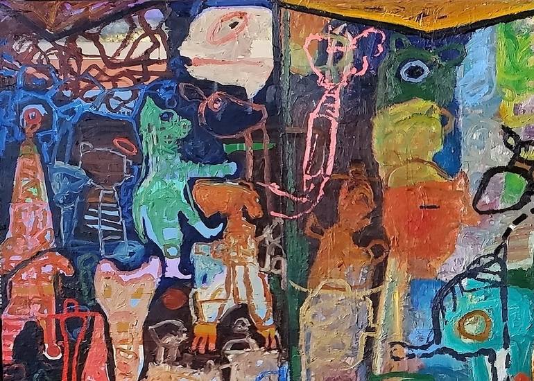 Large scale earth toned clustering of circus-like atmosphere. Abstract and distorted figures crowd a dense color field. Horizontally oriented and cartoonishly epic in scope. oil is applied in a thickly textured impasto. Art Historical influences like Rubens, Max Beckmann, Neo Rauch, Cecily Brown,...