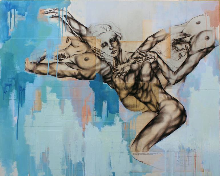 Emila Sirakova was born in 1984 in Bulgaria and lives in Italy since 1994. She begin to drawing at 5 years old and from this point never stops. Through painting and performances, Emila faces and deepen the experience of the human body, as a projection of the being, vision of self and her own emotions. All the characters try to have an external look on themselves among so tense and twirled positions that could be turned into draconian emotions: all those moments when, crouched down, we think, overthink, try to forget or dream. In all those moments we just go numb: we loose contact with flash and bones and we try to touch that part of ourselves made of spirit, traces and gestures. Emila uses several layers of papers and strokes, blending them together as a stream of consciousness or memories. Not always clear, often nostalgic and dim, pale images and maniacally detailed particulars live together. Emila mostly depicts feminine figures, the subconscious, the primordial feminine origin, using them to spread all her dreams and projections. Sometimes pleasant, sometimes provocative or dark. In her last works, Emila develops the theme of drawing on draws: tattoos. Seen as a tale, a moment, like thoughts busting out from flash, with constant homage to famous artists and paintings which made art history. Another level of tale is the canvas: ancient used papers gathered from second hand markets. A sort of tale into the tale which shows us a world full of thoughts and dreamlike projections, brought back to us with vivid colors tied to the tattoo tradition’s inks, as the blue, red and black for bigger paintings.