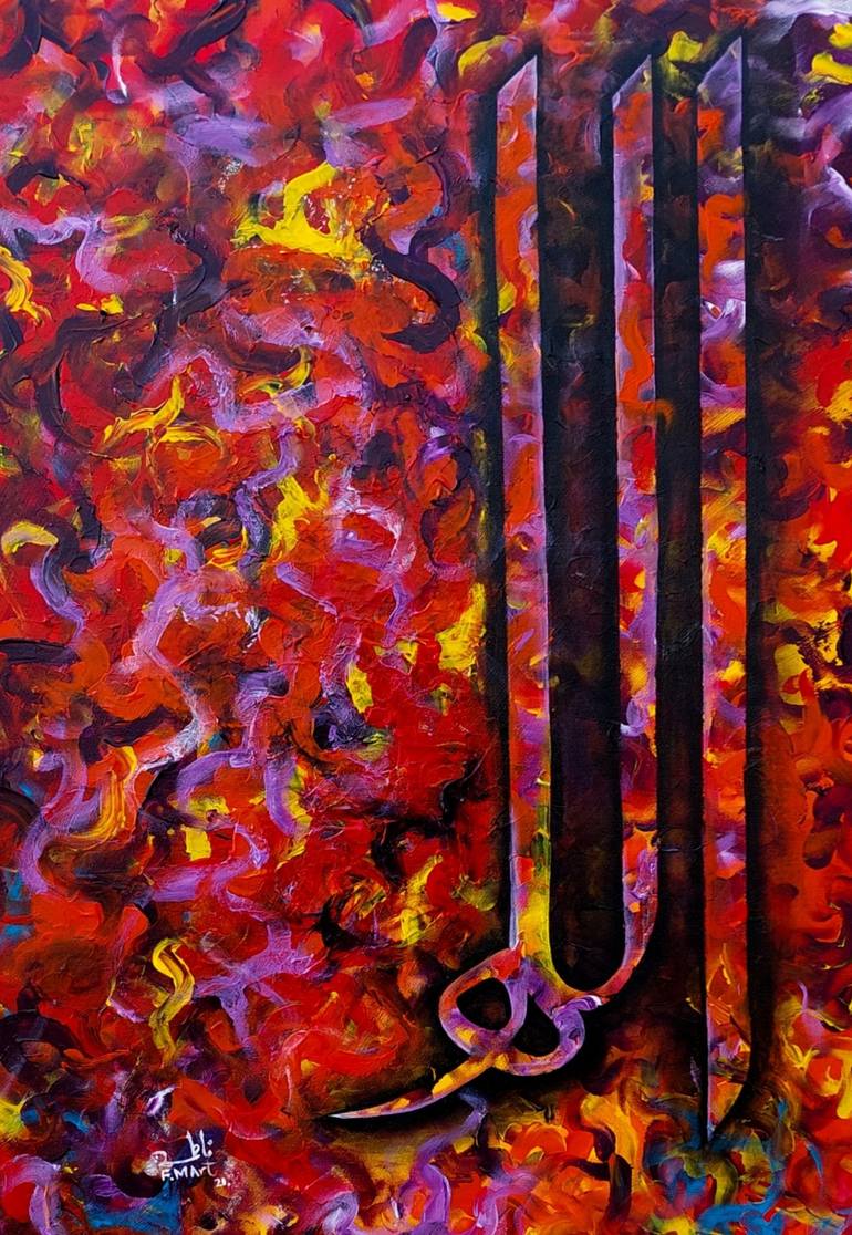 Asalam u alikum Medium = Acrylics on canvas ( texture with acrylic paints) Size = 17 × 25 inches Well varnished Red orange black purple and yellow Writing = Allah Orignal hand made painting copy rights reserved.. Dm for inquiries .m ( Instagram ) oR .