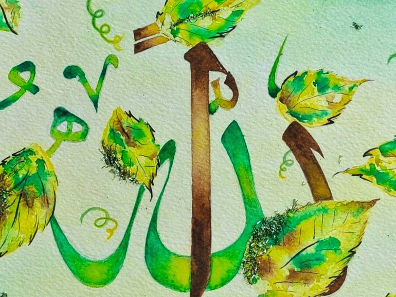 This Allah name calligraphy is hand painted, watercolor+gouache medium with a touch of leafy greens texture, pushing the art towards Nature, mixed with a little glittering touch. Surely a thing to buy ??....