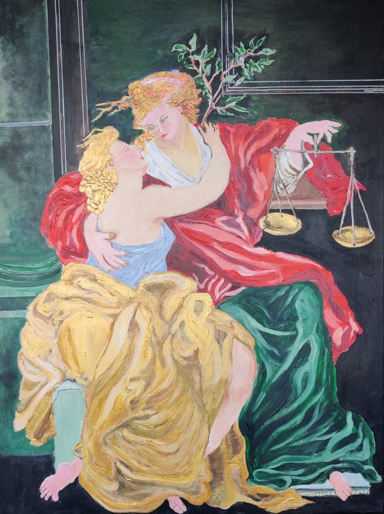 This Allegorical and Symbolic painting in the tradition of Italian Old Masters depicts Peace with an olive branch and Justice with scales in her hand in a loving embrace. This painting is on high quality box canvas and ready to hang and can be framed as well.
