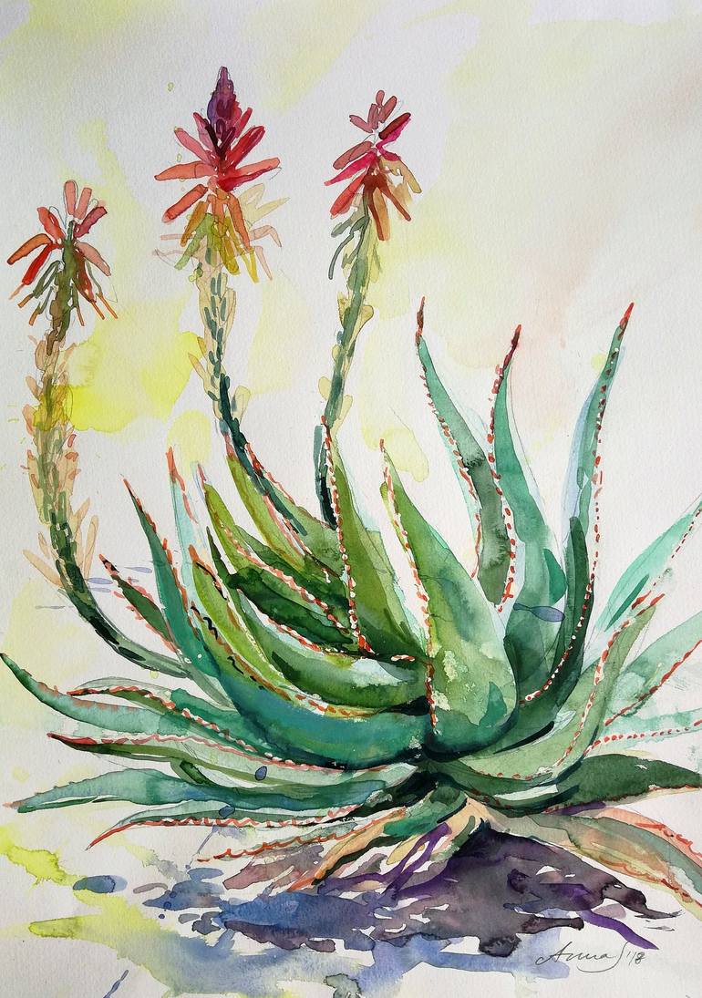 I painted this picture during my trip to Sardinia in May 2018. We lived in a villa surrounded by flowering lemon trees and olive trees. Тext to the terrace grew a large aloe cactus, which had just begun to bloom. I liked the combination of powerful green leaves and delicate red inflorescences. Mate...