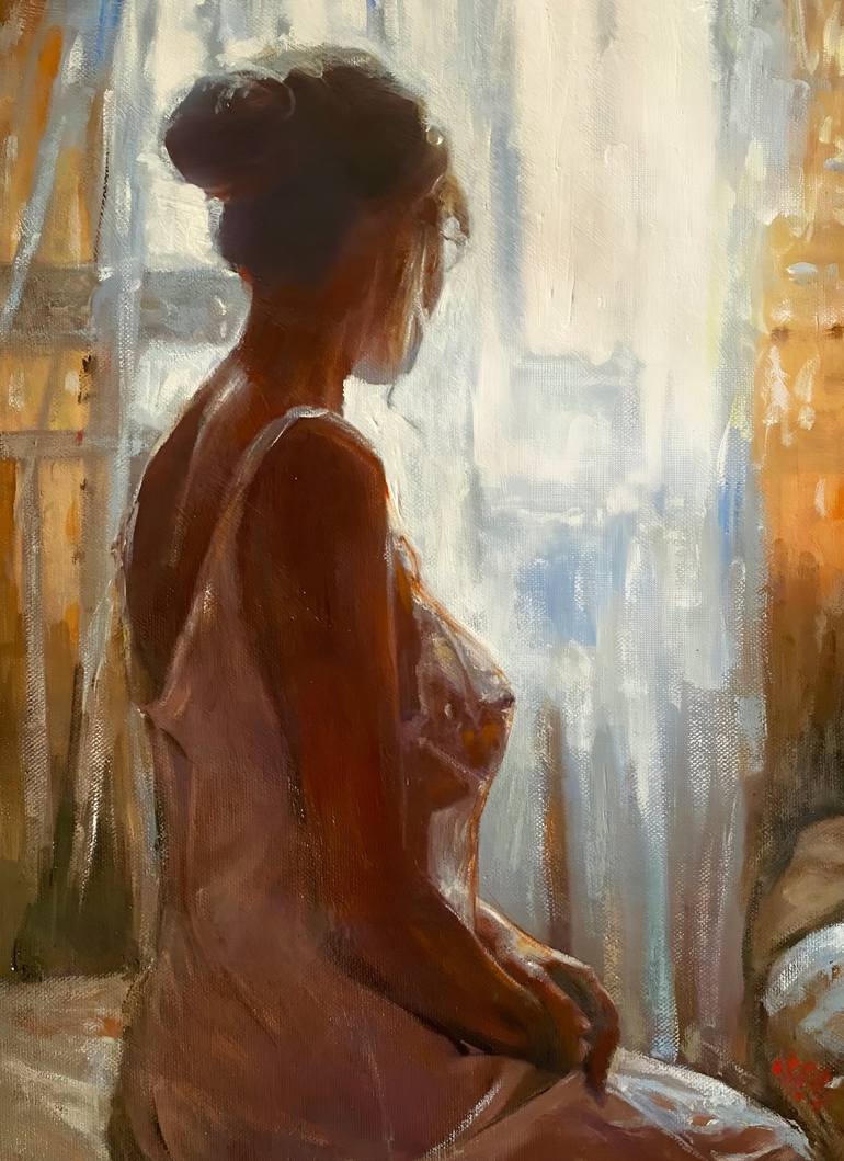 In this evocative painting, a contemplative woman sits gracefully by the window, her gaze lost in the quiet expanse of her thoughts. The soft, dappled light filters through the glass, casting a warm glow upon her features and creating an intimate atmosphere. The artist employs a delicate interplay...