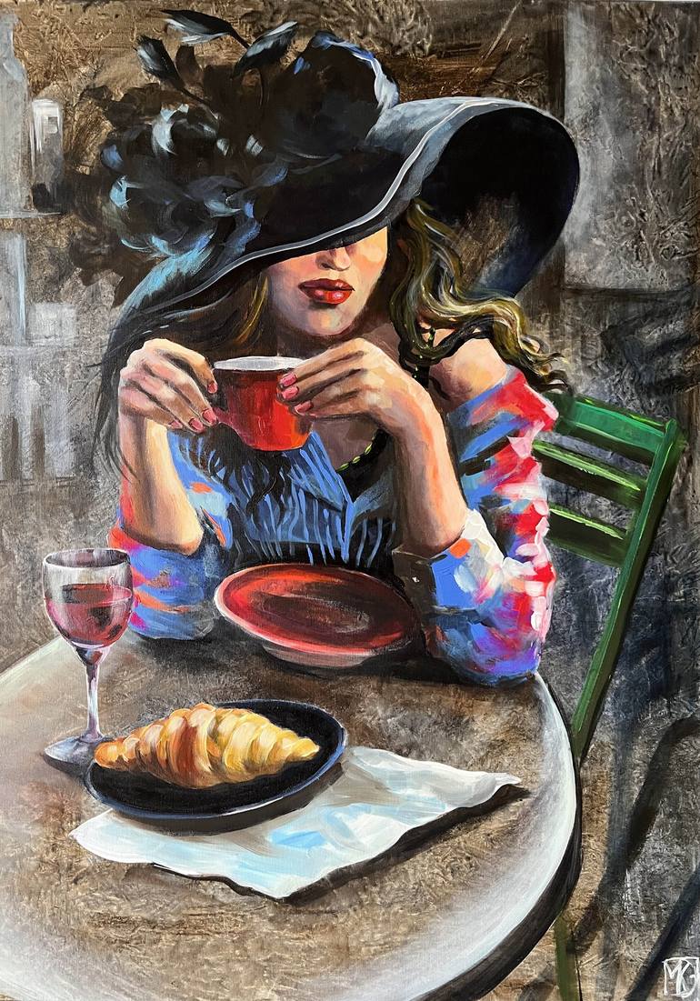 This is a romantic portrait of a bored lady, done in an expressive manner. The synergy of monochrome and bright colors creates a beautiful combination of restraint and chic.