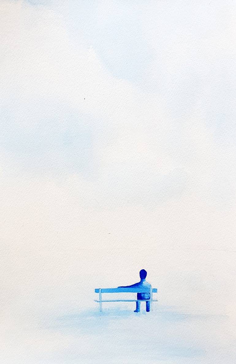 'Alone' is a blue ink monochromatic painting of a landscape. This painting is part of a collection of chinese inspired ink paintings. Based on solitude, minimalism and serenity, this painting embodies these repeating themes, and motifs of a mountainous landscape and lone figure throughout the collec...