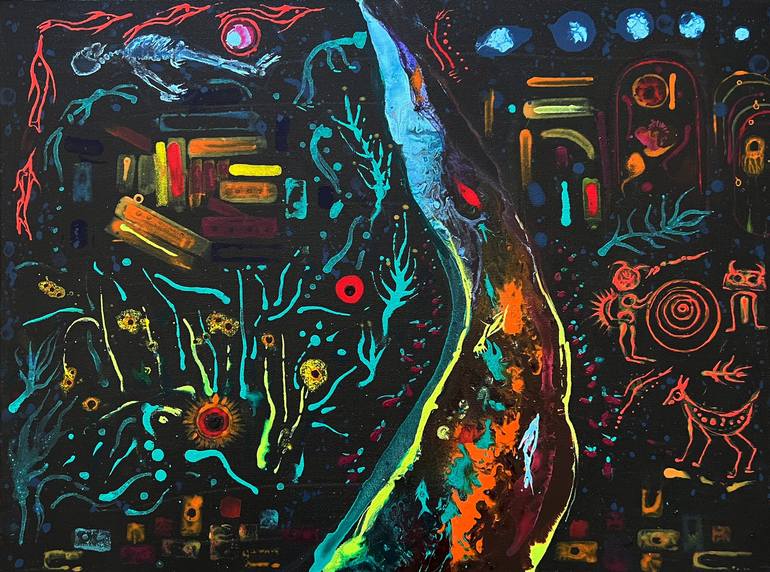 Inspired by Northern New Mexico Rio Grande locations. Artist Ken Feldman Created 09.2024 24x18 inches Acrylic medium.