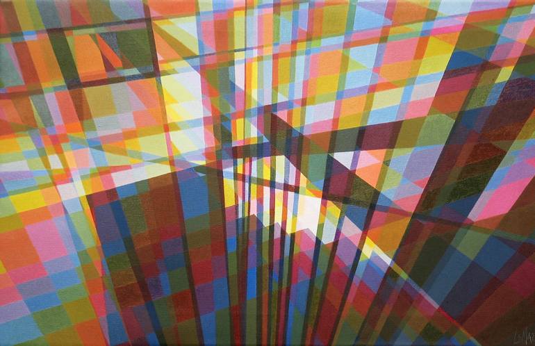 Using an interior scene as my inspiration, I segmented the objects in the scene into polygons. Those polygons would then serve as a structure upon which the rest of the painting could be executed. The painting has a wire for hanging and a black edging.