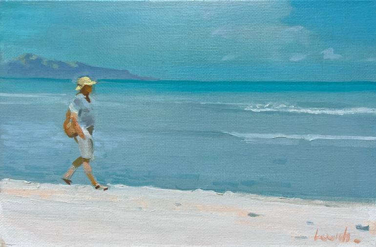 Dive into the serene ambiance of "Along the Shore," an evocative masterpiece by the renowned Ukrainian artist, Alexander Levich. With a rich interplay between realism and impressionistic nuances, this piece encapsulates a tranquil morning along the seaside. A lone figure, symbolically representing L...