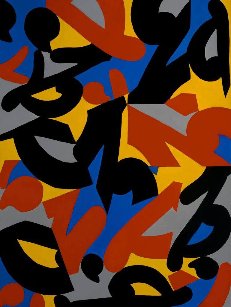 I used handwritten letters from the alphabet and cut them up to make graphic shapes. I hand printed the shapes and then painted the image with gouache and acrylic paints. I am inspired by Paul Klee's work as well as abstract artists of the early 20th Century.