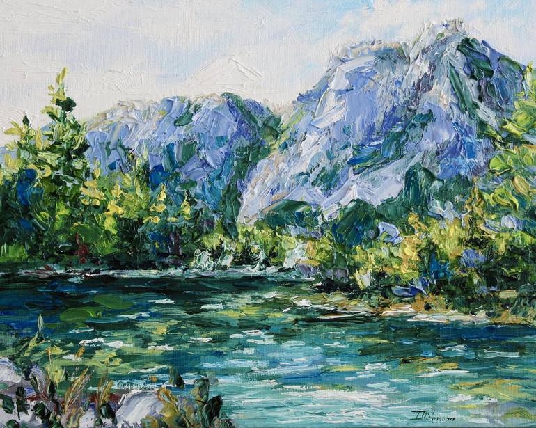 This painting is a reflection of the quiet awe I feel when standing before nature’s untouched beauty. With expressive oil strokes and a rich palette of cool blues, deep greens, and golden light, I aimed to capture not just a landscape, but a feeling—the crisp mountain air, the gentle ripple of water...