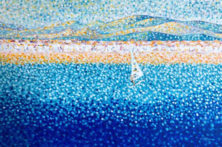 Altafulla, Spain - Mediterranean seascape with sailboarder This painting representing a Mediterranean seascape is a tribute to the sea and to travels. Thousands of dots are composing this original contemporary painting. The artist created this artwork in an impressionistic style and the technique of...