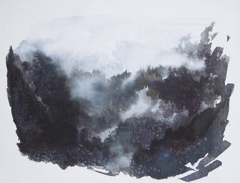 Layered painting in ink on sized canvas. Inspired by misty valleys around the village of Alton. The base colour is white and the ink has (true to form) shifted from deep black to grey-blue with subtle metallic copper hints. Signed & dated on both the front and back. This piece was painted on a dee...