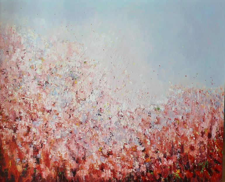 A floral painting of texture and colour in the middle of summer in the garden. When you plant a seed you always hope for an explosion of colour and growth and the red colour is an expression of that. It's painted with both pallet knife and brush on a deep edge canvas with the edges left white and ...