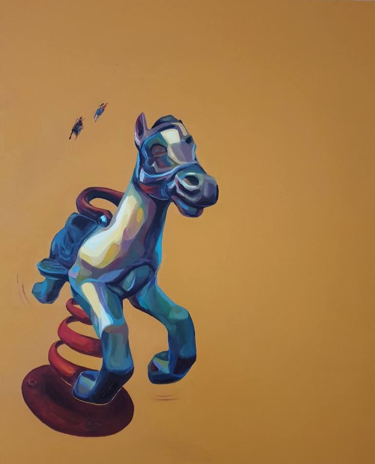 This is a toy riding horse.This is a fantasy of that child that she is in a live horse race and riding it like crazy and in the end, she is the winner. Of course in each race she is always the Winner ! All the back you can see tiny other horses far back there...