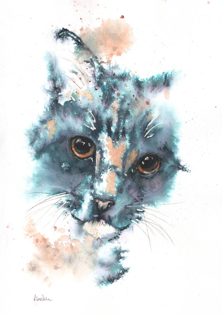 The original painting is 30 cm wide x 42 cm high. It is signed on the front and left unframed. It comes with a signed Certificate of Authenticity. I use Winsor & Newton Cotman watercolours on acid-free 300gsm paper; sometimes I also use ink. A soulful little cat in need of loving attention who kno...