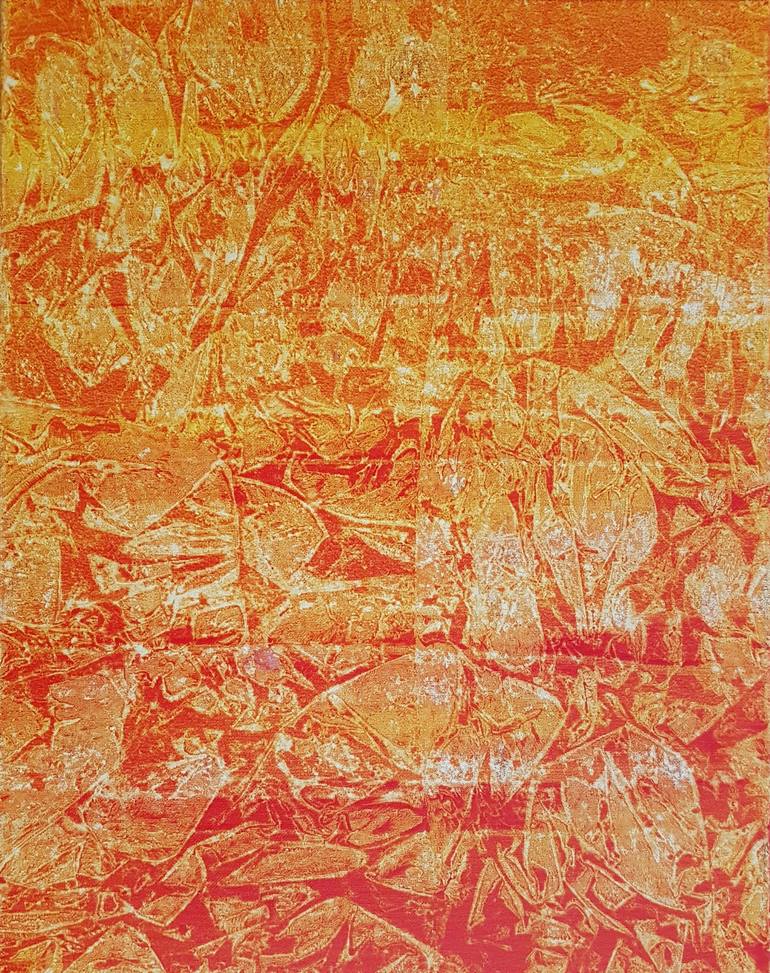 Abstract impression of a rock face ba[hed in orange setting sunlight. Multiple glazes used to create impression of depth.