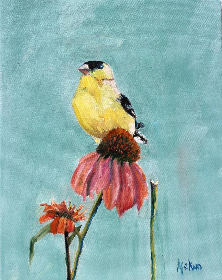 I have tried everything to capture this beauty to no avail with bird seeds. Finally this year, I planted cone flowers which not only attracts beautiful butterflies but the elusive goldfinch. Part of my bird collection, American Goldfinch on Coneflower, oil on canvas. Ready to hang.