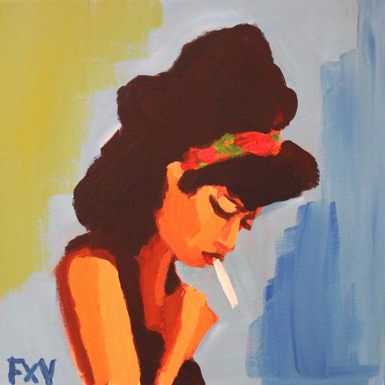 This vibrant portrait is a stunning representation of the iconic Amy Winehouse. The artist captures her unmistakable features and aura, blending expressive brushstrokes with bold color contrasts. The fiery orange and red tones in her face and hairband evoke passion and intensity, while the cool blue...