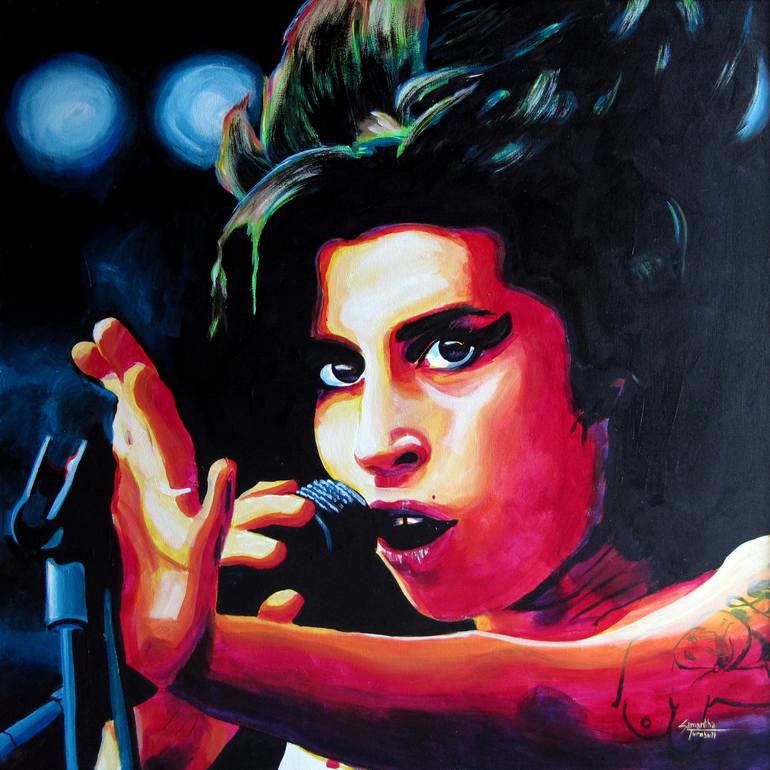 I paint my portraits while listening to the music of artist that I am painting. This inspires the bold, acidic colours, and the high contrast. I wanted to capture Amy with acidic green hair, tattoos, and her amazing voice. Try listening to your favourite Winehouse tune, while gazing at this piece an...