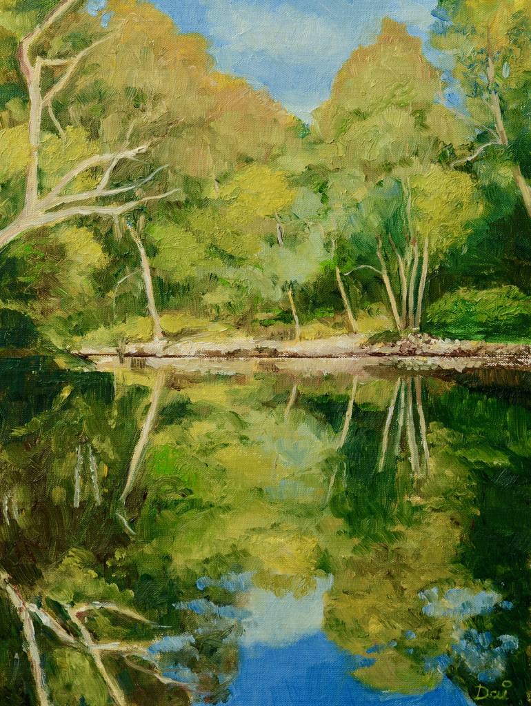 The absolutely tranquil scene is of a bend of the Yarra (Birrarung) River at Ivanhoe, east of Melbourne. The "chink" of bell birds filled the clean, cool, morning air. I took several photographs during an early morning walk yesterday, and painted this image in the afternoon. Not quite "plein air...