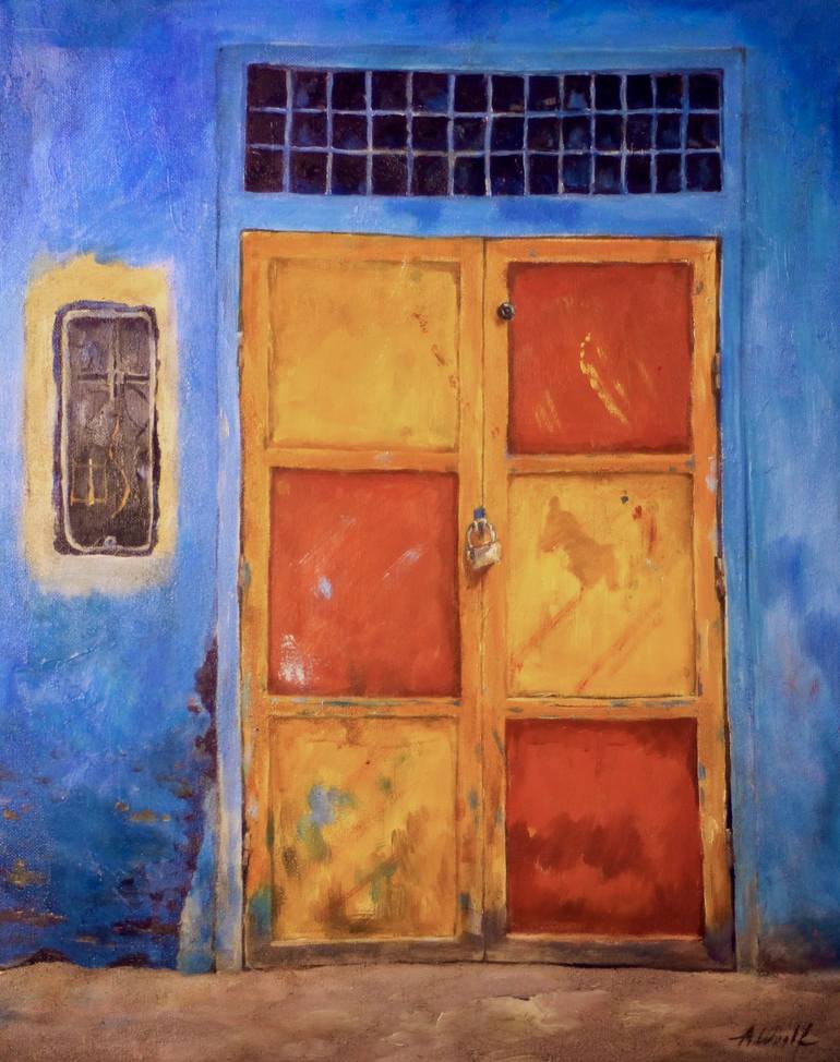 A vibrant yellow and red door stands against a blue wall with some distressed textures. Above the door, there is a window with dark grilles, and to the left side, an old-fashioned light fixture is visible.