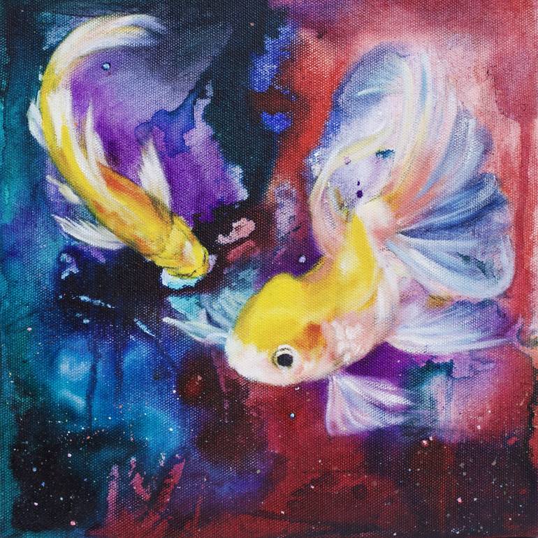 'An Underwater Cave' is a captivating mini mixed media painting that beautifully merges the realms of semi-abstract and realist art. This artwork depicts two fishes immersed in a dreamy, magical atmosphere that blurs the lines between reality and imagination. The interplay of mediums, including acry...